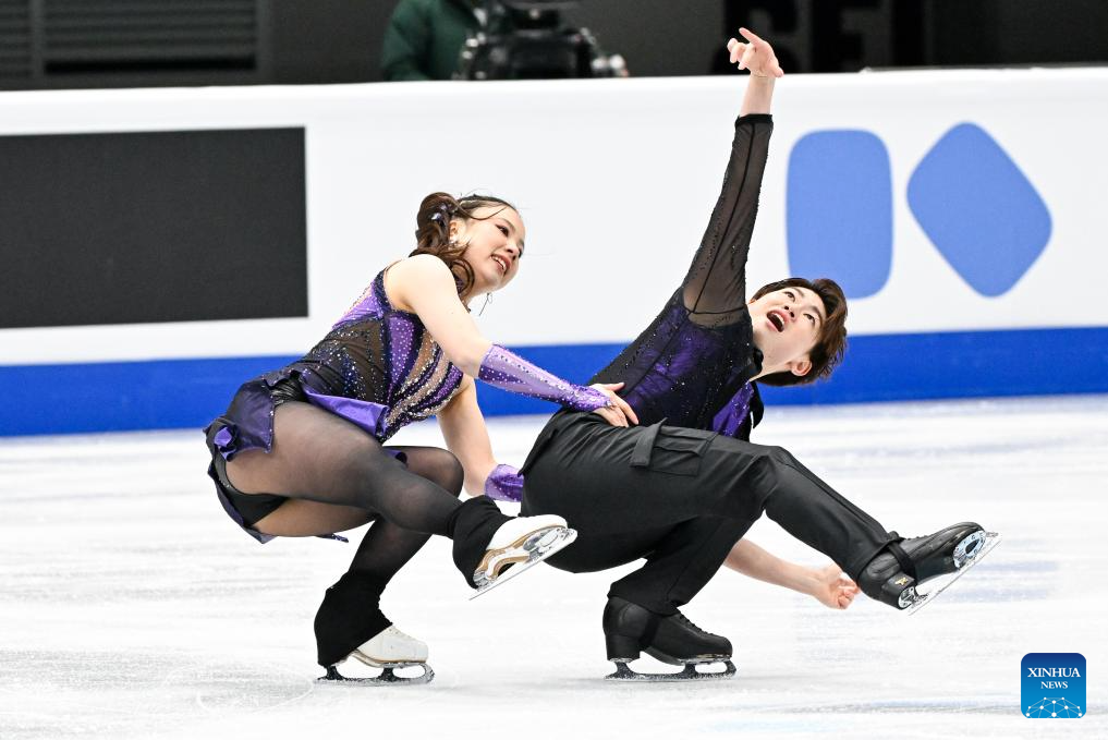 Yoshida Utana (izquierda) y Morita Masaya, de Japón, actúan durante la danza rítmica sobre hielo en el Campeonato de Patinaje Artístico de los Cuatro Continentes de la ISU, celebrado en Beijing, China, el 22 de enero de 2026. (Xinhua/Ju Huanzong).