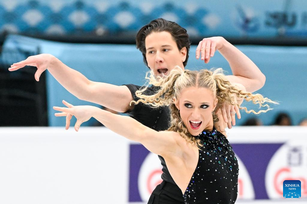 Emilea Zingas (delante) y Vadym Kolesnik, de Estados Unidos, actúan durante la danza rítmica sobre hielo en el Campeonato de Patinaje Artístico de los Cuatro Continentes de la ISU en Beijing, China, el 22 de enero de 2026. (Xinhua/Ju Huanzong).