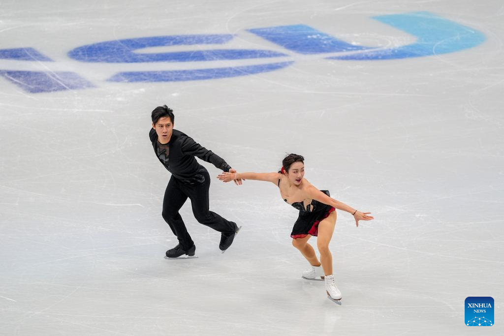 Sui Wenjing (derecha) y Han Cong, de China, actúan durante el programa corto por parejas en el Campeonato de Patinaje Artístico de los Cuatro Continentes de la ISU en Beijing, China, el 22 de enero de 2026. (Xinhua/Xie Han).