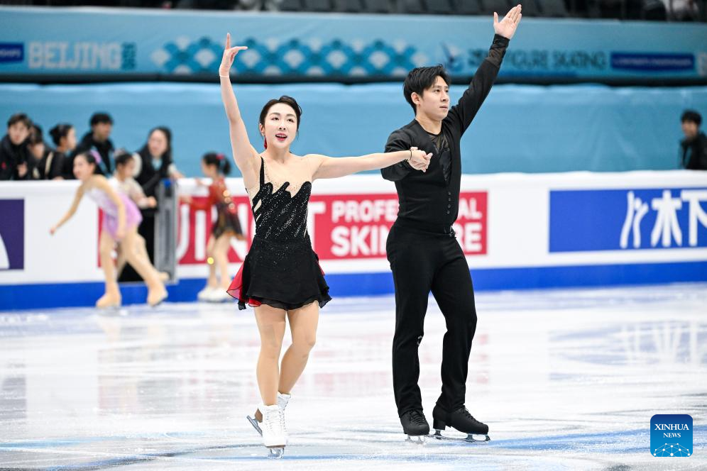 Sui Wenjing (izquierda) y Han Cong, de China, saludan a los espectadores tras el programa corto por parejas en el Campeonato de Patinaje Artístico de los Cuatro Continentes de la ISU, celebrado en Beijing, China, el 22 de enero de 2026. (Xinhua/Ju Huanzong).