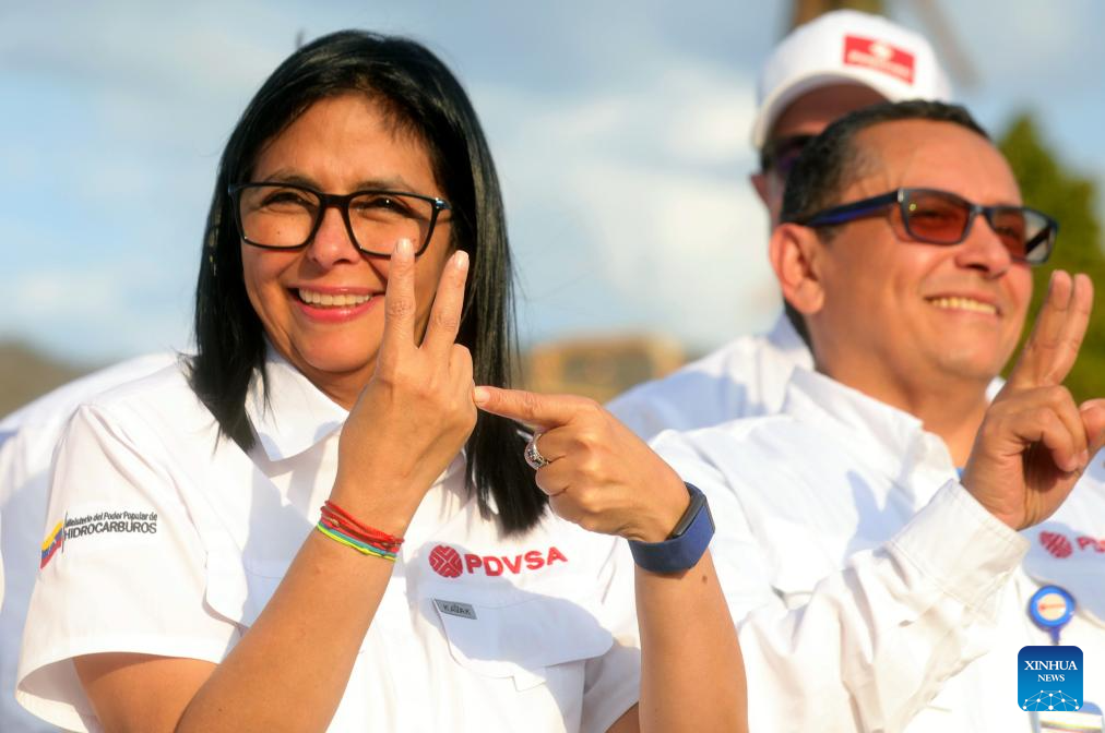 Imagen proveída por la Presidencia de Venezuela de la presidenta encargada venezolana, Delcy Rodríguez (i), participando en un acto en Puerto La Cruz, en el estado Anzoátegui, Venezuela, el 25 de enero de 2026. La reforma de la Ley Orgánica de Hidrocarburos que impulsa el Gobierno de Venezuela servirá para la "felicidad económica" del país, afirmó el domingo la presidenta encargada, Delcy Rodríguez. (Xinhua/Presidencia de Venezuela)