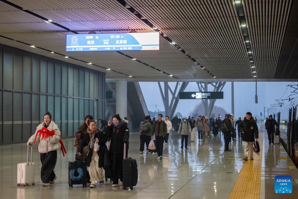 Pasajeros suben al tren No. G340 en la estación de Ferrocarril de Wuhan, en Wuhan, en la provincia de Hubei, en el centro de China, el 26 de enero de 2026. Un nuevo horario de trenes a nivel nacional entró en vigor en China a partir del 26 de enero de 2026 con una mayor capacidad y eficiencia en el transporte de pasajeros y mercancías. (Xinhua/Wu Zhizun)