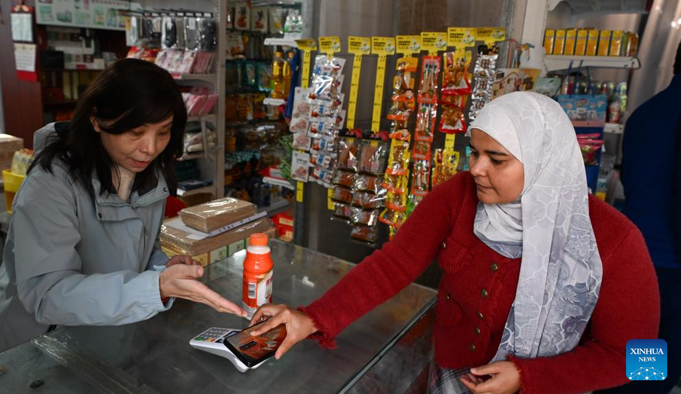 Fardous Muhammad Tawfik Abdelwanis (derecha) utiliza un servicio de pago móvil en una tienda de comestibles en Haikou, provincia de Hainan, sur de China, el 7 de enero de 2026. Fardous Muhammad Tawfik Abdelwanis, de Egipto, es actualmente investigador en la Academia China de Ciencias Agrícolas Tropicales en Hainan, sur de China. (Xinhua/Yang Guanyu).
