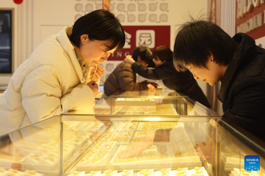 Clientas seleccionan accesorios de oro en una tienda de oro, en el poblado de Yuyue, en la ciudad de Huzhou de la provincia de Zhejiang, en el este de China, el 29 de enero de 2026. Tanto el precio internacional del oro al contado como el precio de los futuros del oro en abril en la Bolsa Mercantil de Nueva York superaron el máximo histórico de 5.500 dólares estadounidenses por onza el 28 de enero. El precio del oro ha subido más de 500 dólares estadounidenses por onza en las últimas 72 horas, y el valor del mercado del oro se ha disparado en más de 3,5 billones de dólares estadounidenses. En total, el precio internacional del oro aumentó aproximadamente un 20 por ciento a principios de 2026. (Xinhua/Ni Lifang)