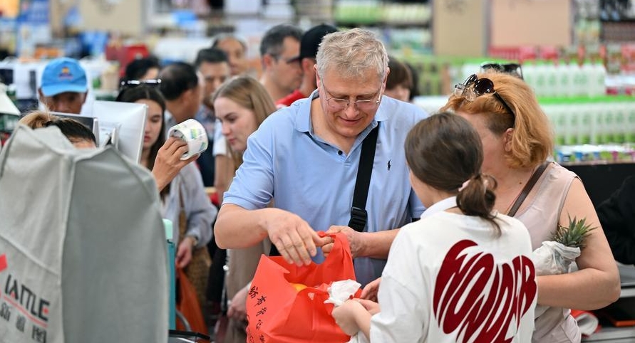 Turistas extranjeros hacen compras en un mercado en Sanya, en la provincia de Hainan, en el sur de China, el 11 de enero de 2026. (Xinhua/Guo Cheng)