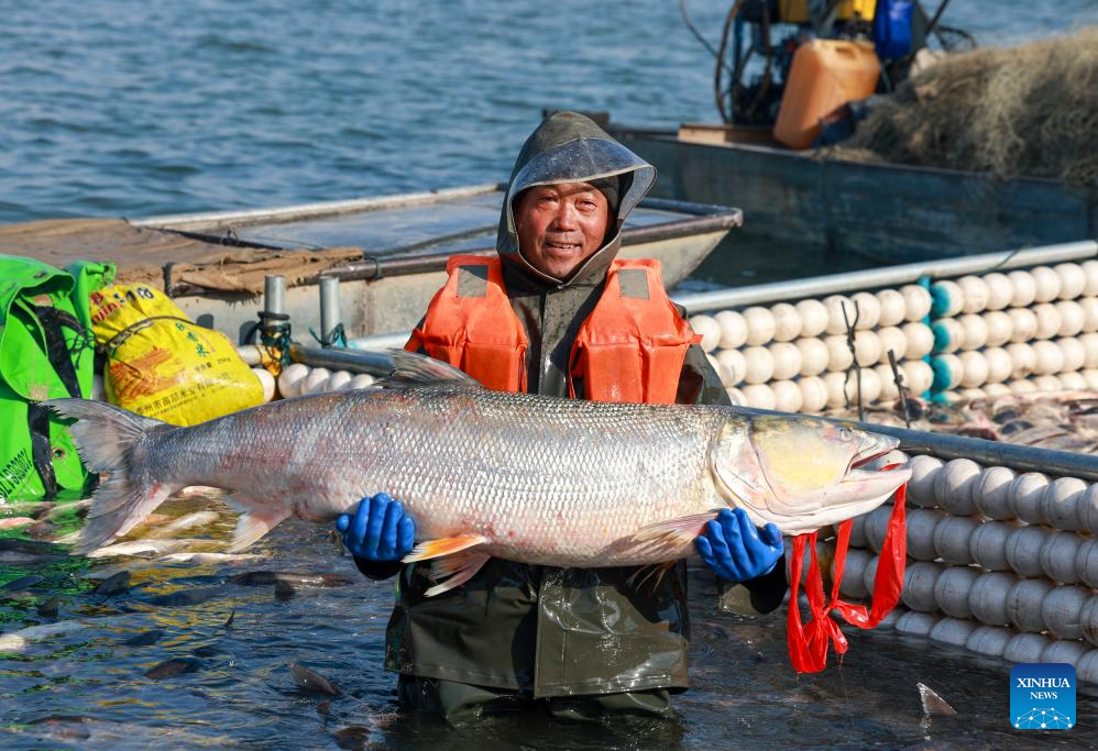 Un pescador muestra un pescado recién capturado durante un evento de pesca de invierno, en Taizhou, en la provincia de Jiangsu, en el este de China, el 31 de enero de 2026. (Xinhua/Gu Jihong)