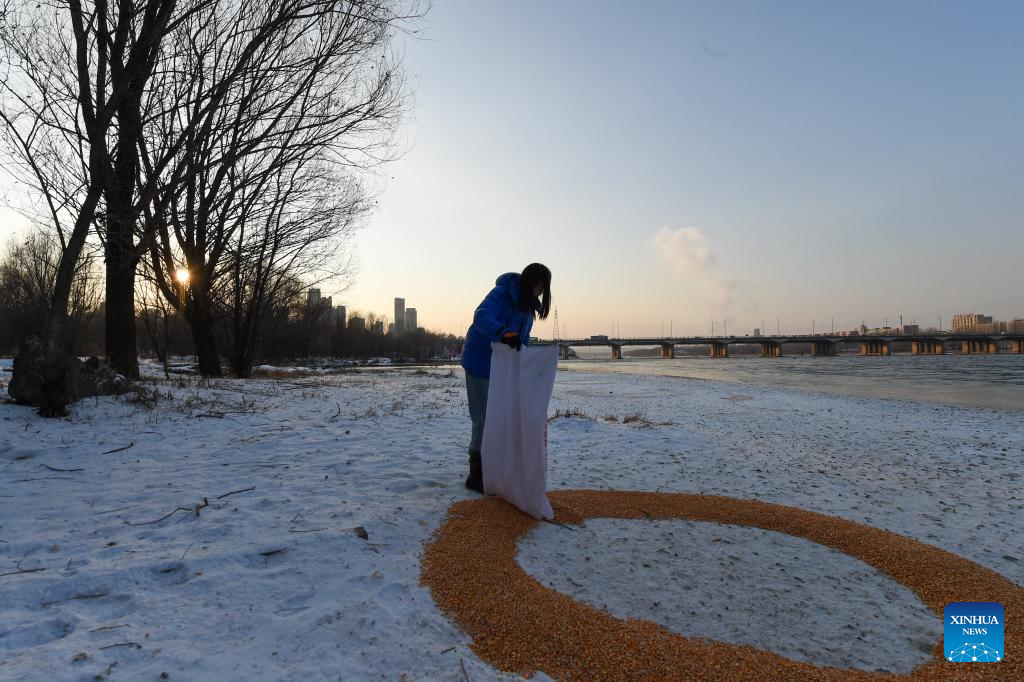 Wang Tingting alimenta a las aves en la isla Changbai, en la ciudad de Jilin, provincia de Jilin, noreste de China, el 28 de enero de 2026. (Xinhua/Zhang Nan).