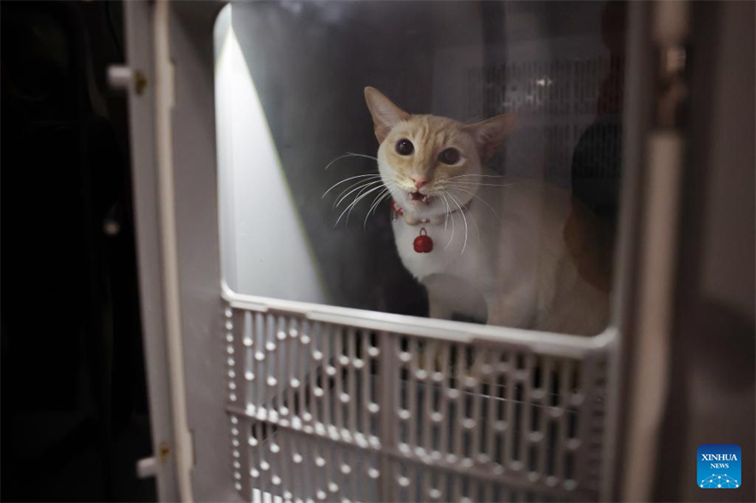 Un gato espera dentro de una jaula de transporte en la zona de entrega de mascotas de China Railway Express en la estación ferroviaria de Lanzhou Oeste, en Lanzhou, provincia de Gansu, noroeste de China, el 1 de febrero de 2026. (Xinhua/Chen Bin).
