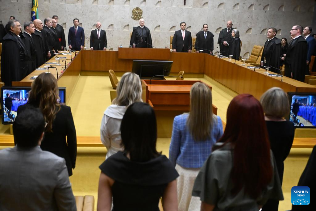 El presidente brasileño, Luiz Inácio Lula da Silva (3-i-atrás), y el presidente del Supremo Tribunal Federal (STF) de Brasil, Luiz Edson Fachin (c-atrás), asisten a la sesión de apertura del Año Judicial 2026, en la sede del STF, en Brasilia, Brasil, el 2 de febrero de 2026. Lula da Silva afirmó el lunes, durante la apertura del Año Judicial en el STF en Brasilia, que las elecciones generales de octubre impondrán el desafío de actuar con máximo rigor contra la manipulación digital y las noticias falsas para proteger la soberanía del voto. (Xinhua/Lucio Tavora)