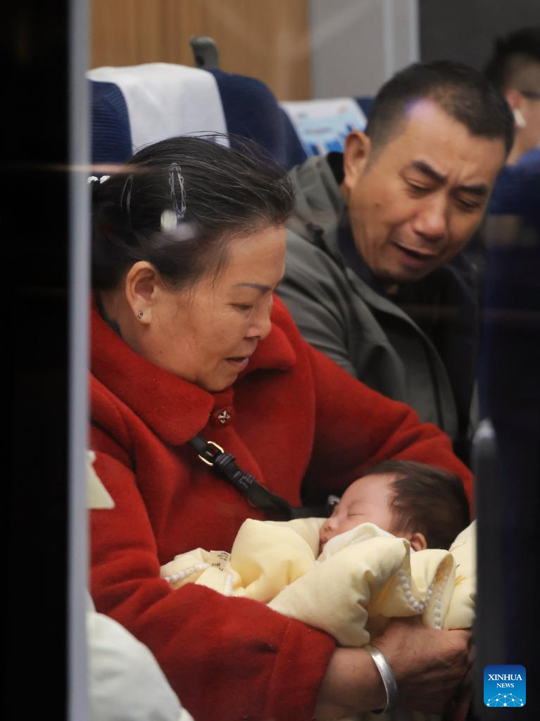 Una mujer cuida a un bebé en un tren en la estación ferroviaria Shenzhen Norte, en Shenzhen, provincia de Guangdong, al sur de China, el 2 de febrero de 2026. (Xinhua/Mao Siqian).
