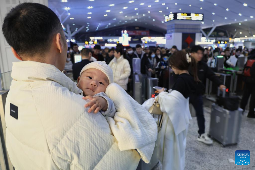Un hombre con un bebé en brazos en la estación ferroviaria Shenzhen Norte, en Shenzhen, provincia de Guangdong, sur de China, el 2 de febrero de 2026. (Xinhua/Mao Siqian).