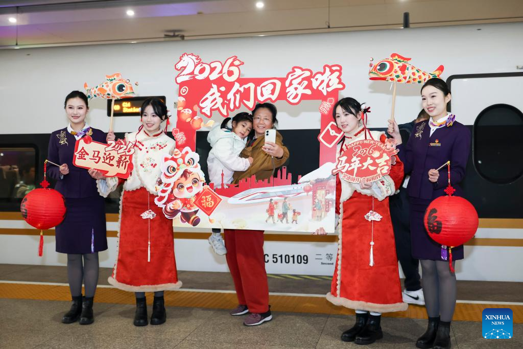 Pasajeras se hacen fotos con las azafatas ferroviarias en la estación de tren de Shanghai Hongqiao, en la ciudad de Shanghai, este de China, el 2 de febrero de 2026. (Xinhua/Wang Xiang).