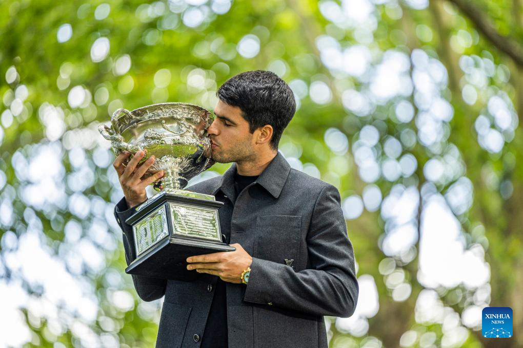 Carlos Alcaraz, de España, posan con la Copa Norman Brookes durante la oportunidad de prensa para el campeón masculino del Abierto de Australia 2026 en el Palacio Real de Exposiciones, en Melbourne, Australia, el 2 de febrero de 2026. (Xinhua/Hu Jingchen)