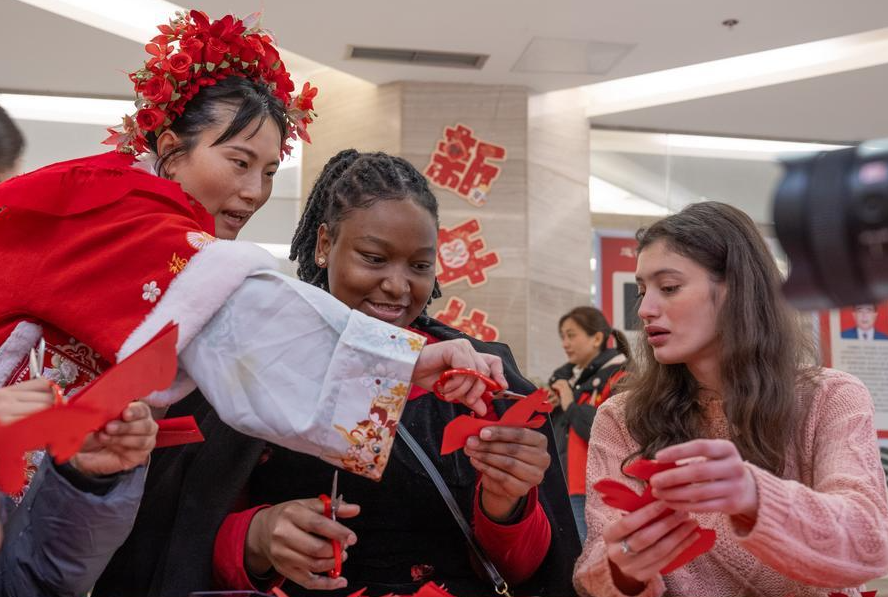 Estudiantes extranjeras prueban el arte del recorte de papel bajo la supervisión de una profesora durante un evento celebrado en el distrito de Banan, en la municipalidad de Chongqing, suroeste de China, el 3 de febrero de 2026. (Xinhua/Chen Cheng).