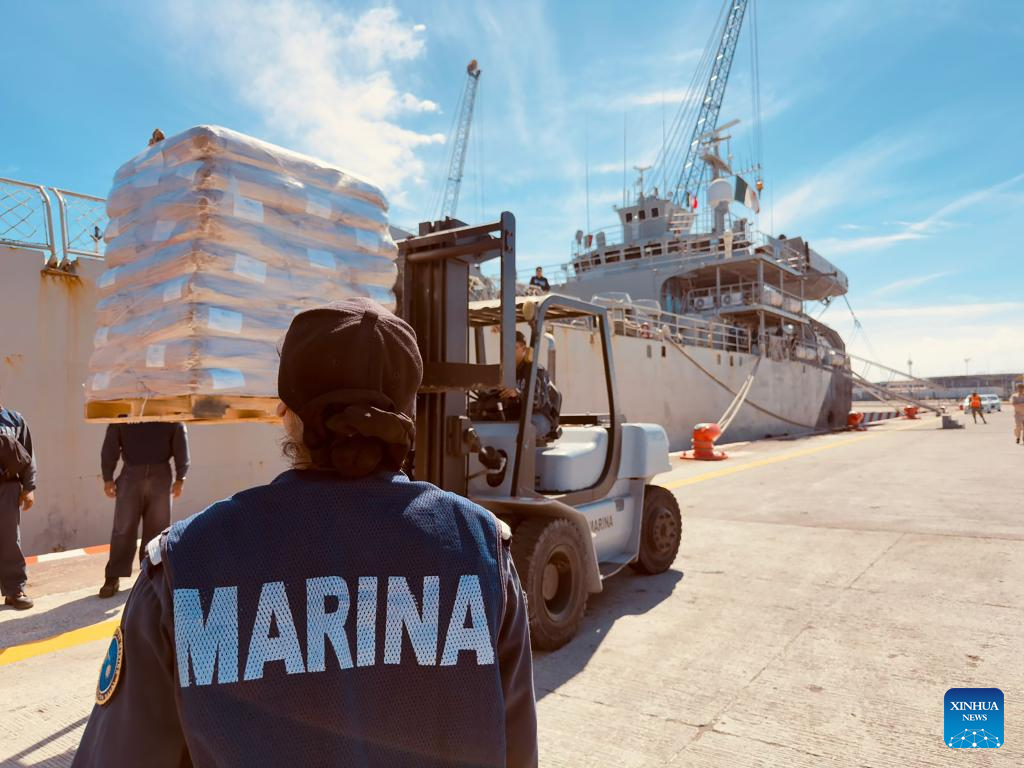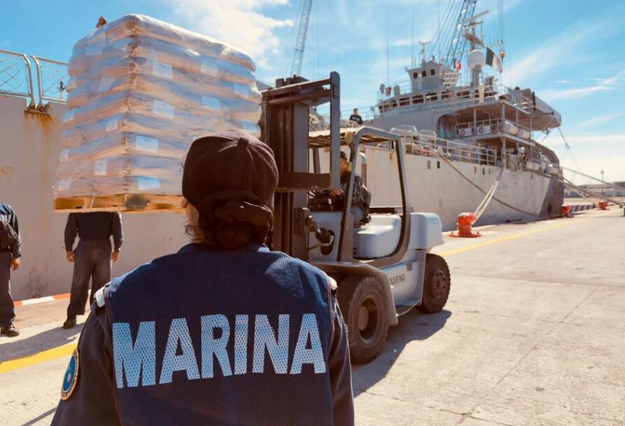 Imagen cedida por la Secretaría de Relaciones Exteriores de México de elementos de la Secretaría de Marina cargando víveres en un buque de la Armada de México, en el puerto de Veracruz, México, el 8 de febrero de 2026. El Gobierno de México envió el domingo dos buques de la Armada de México con más de 814 toneladas de víveres destinados a la población civil de la isla de Cuba, confirmó la Secretaría de Relaciones Exteriores de México. (Xinhua/Secretaría de Relaciones Exteriores)