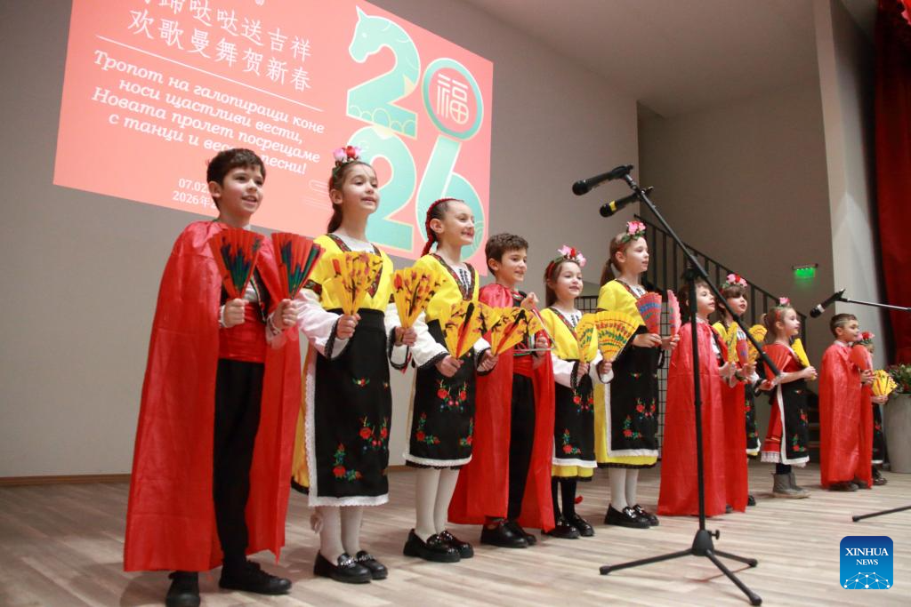 Imagen del 7 de febrero de 2026 de niños búlgaros realizando una presentación durante la celebración del próximo Año Nuevo chino en el Instituto Confucio, en Sofía, Bulgaria. (Xinhua/Marian Draganov)