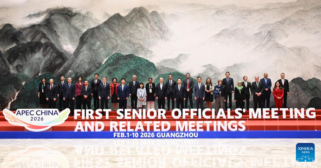 Representantes que asisten a la primera Reunión de Altos Funcionarios de APEC China 2026 posan para una fotografía grupal, en Guangzhou, en la provincia de Guangdong, en el sur de China, el 10 de febrero de 2026. La sesión inaugural de la primera Reunión de Altos Funcionarios de APEC China 2026 se celebró aquí el martes. (Xinhua/Deng Hua)