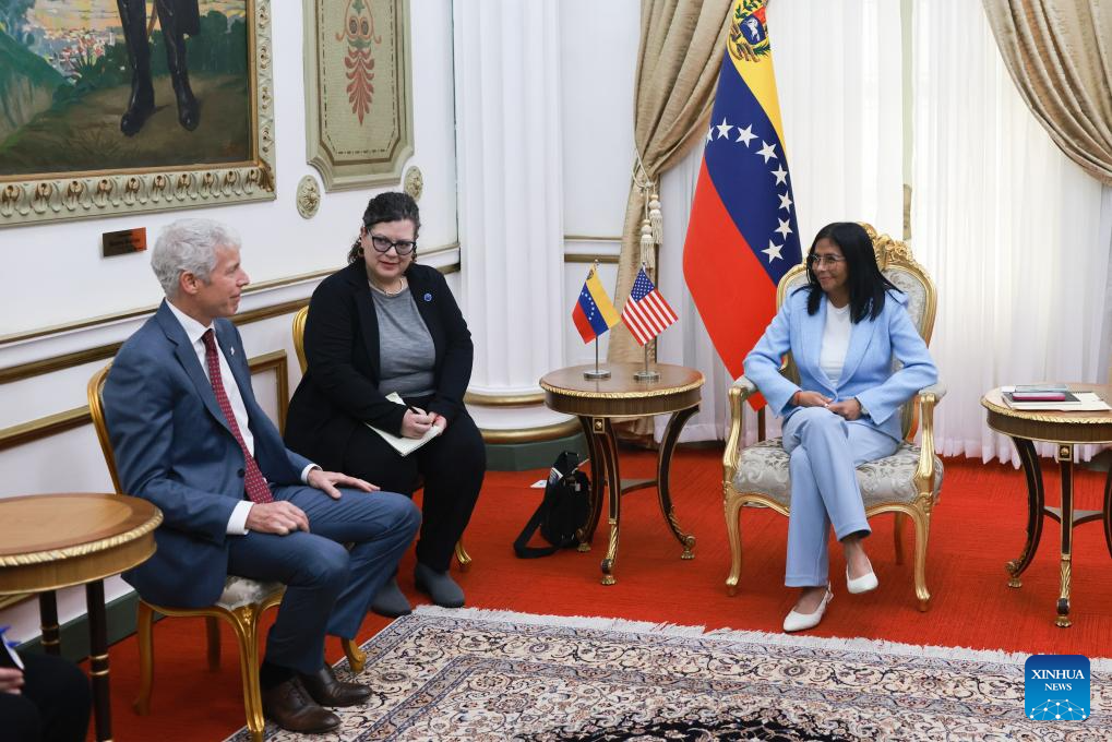 Imagen proveída por la Presidencia de Venezuela de la presidenta encargada venezolana, Delcy Rodríguez (d), conversando con el secretario de Energía de Estados Unidos, Christopher Wright (i), en el Palacio de Miraflores, en Caracas, Venezuela, el 11 de febrero de 2026. Rodríguez recibió el miércoles en el Palacio de Miraflores, sede del Gobierno venezolano, a Wright, con el objetivo de revisar la agenda bilateral en beneficio de ambos países. (Xinhua/Presidencia de Venezuela)