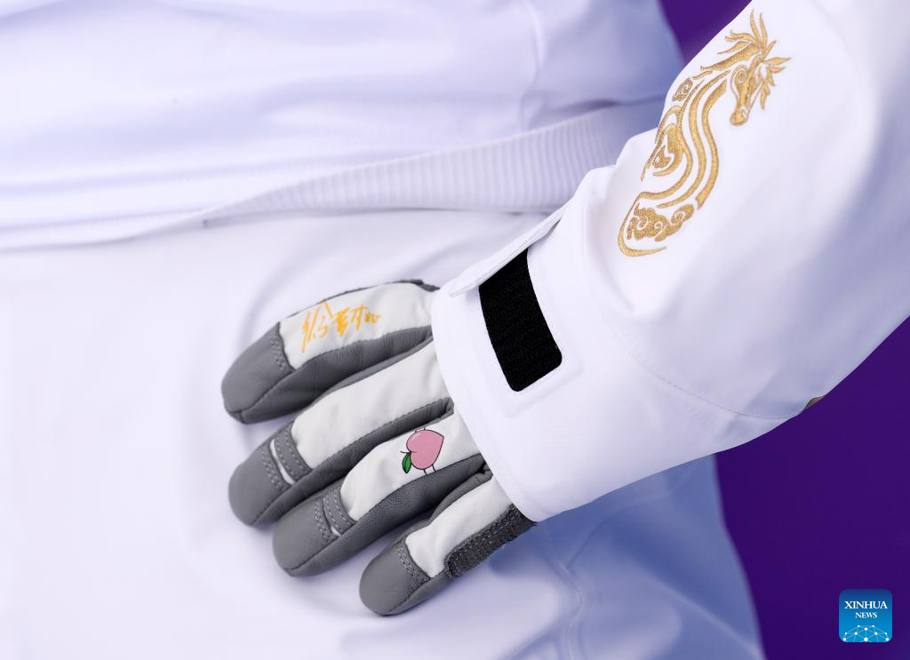 Imagen del 20 de febrero de 2026 del guante de Wang Xindi, de China, con las palabras inscritas "para Mengtao", una referencia a su esposa Xu Mengtao, quien ganó la medalla de oro de aerials femenino de esquí acrobático, durante la final 1 de aerials masculino de esquí acrobático en los Juegos Olímpicos de Invierno Milán-Cortina 2026, en Livigno, Italia. (Xinhua/Hu Chao)