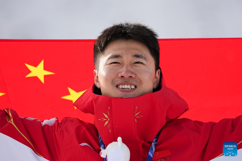 El medallista de oro Wang Xindi, de China, posa durante la ceremonia de premiación de aerials masculino de esquí acrobático en los Juegos Olímpicos de Invierno Milán-Cortina 2026, en Livigno, Italia, el 20 de febrero de 2026. (Xinhua/Wu Huiwo)