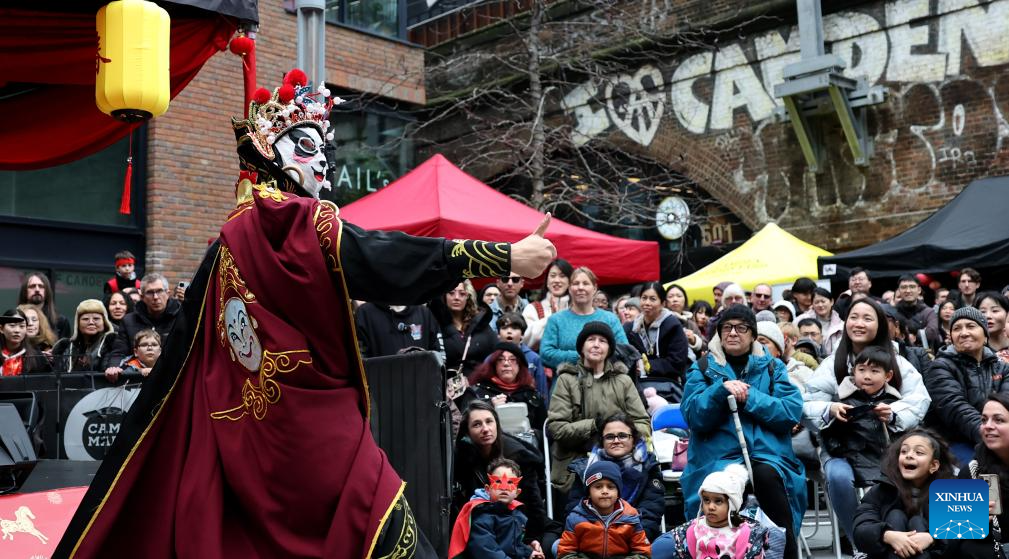Imagen del 21 de febrero de 2026 de personas observando una presentación de cambio de cara de la Opera de Sichuan, durante una celebración del Año Nuevo chino, en el Mercado de Camden, en Londres, Reino Unido. (Xinhua/Li Ying)