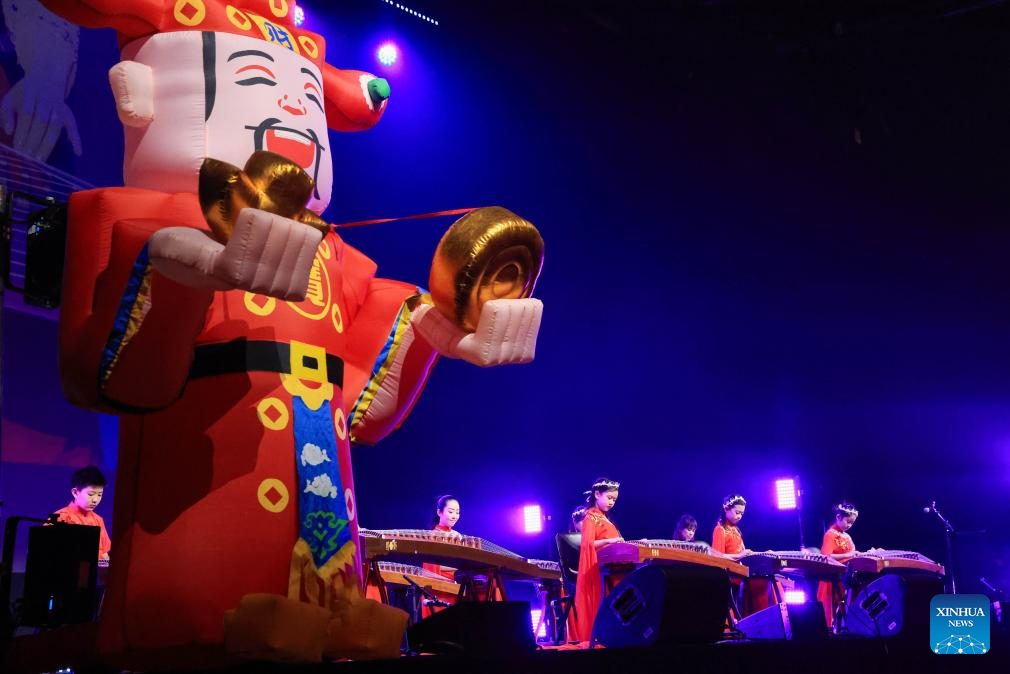 Una presentación de música folclórica se lleva a cabo durante una celebración de la Fiesta de la Primavera, en Wellington, Nueva Zelanda, el 22 de febrero de 2026. (Xinhua/Meng Tao)