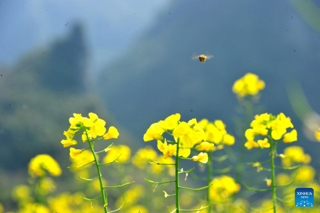 Una abeja vuela sobre las flores de colza en la aldea de Xinyin, en la localidad de Siba, distrito autónomo de la etnia mulao de Luocheng, región autónoma de la etnia zhuang de Guangxi, en el sur de China, el 20 de febrero de 2026. (Foto de Wu Yaorong/Xinhua).
