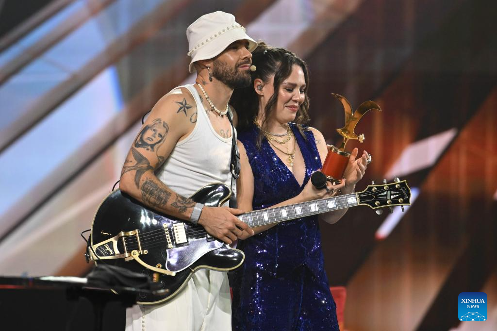 Imagen del 24 de febrero de 2026 del dueto mexicano, Jesse & Joy, reaccionando después de recibir la Gaviota de Oro durante la 65ª versión del Festival Internacional de la Canción de Viña del Mar, en Viña del Mar, Chile. (Xinhua/Jorge Villegas)