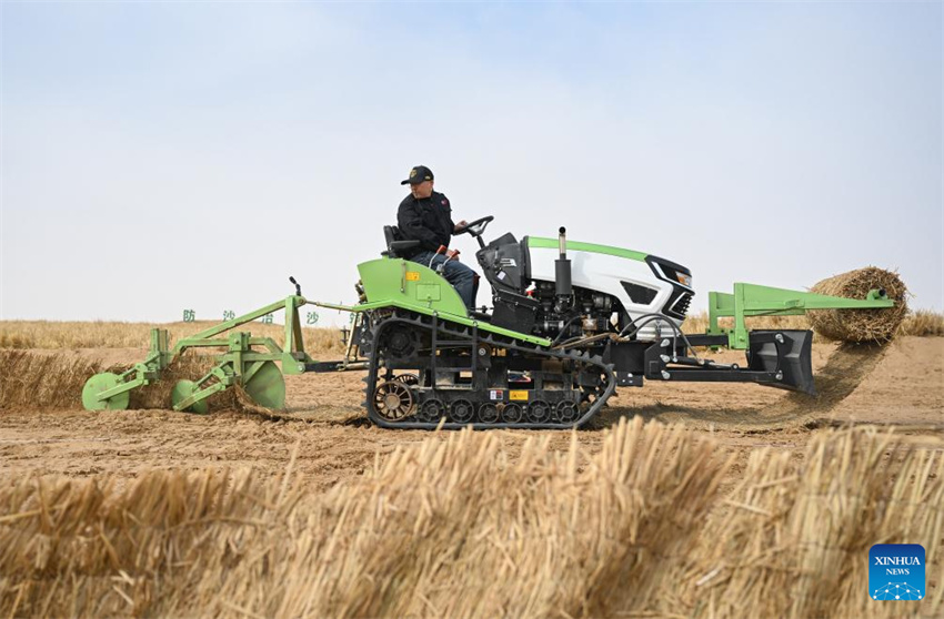 Un trabajador conduce una máquina para el control de la arena en el desierto de Ulan Buh, liga de Alxa, región autónoma de Mongolia Interior, en el norte de China, el 28 de febrero de 2026. (Xinhua/Bei He).