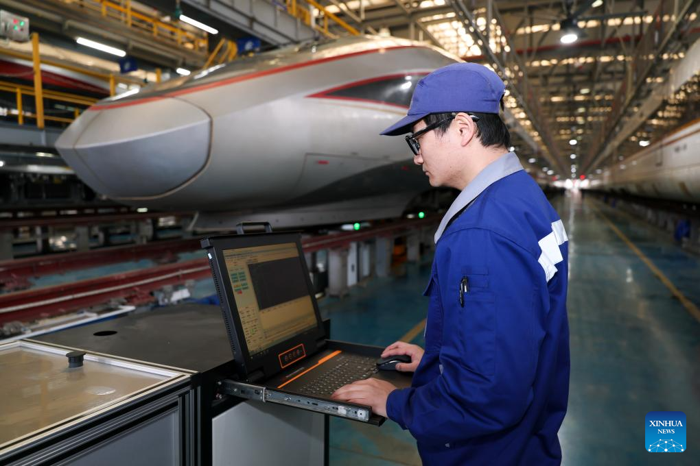 Un mecánico comprueba las ruedas de una unidad múltiple eléctrica (EMU) con un detector de fallos ultrasónico inteligente en un depósito de EMU de la sección EMU de Shanghai, en el este de China, el 28 de febrero de 2026. (Xinhua/Wang Xiang).