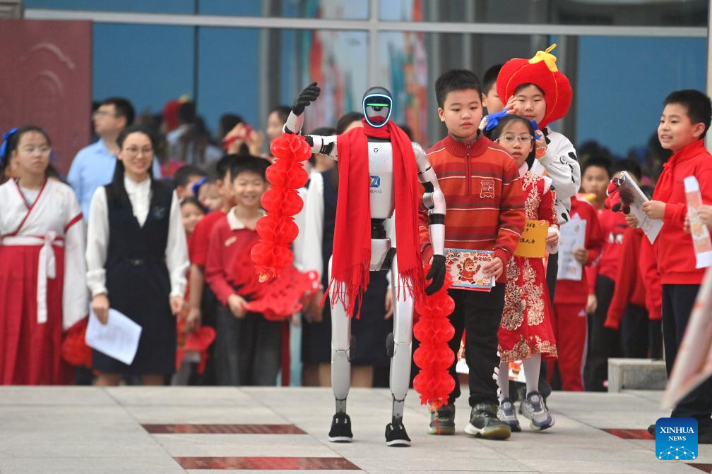 Los alumnos, junto con un robot humanoide, felicitan el Año Nuevo chino en la ceremonia de apertura del nuevo semestre en una escuela primaria de Nanning, en la región autónoma de la etnia zhuang de Guangxi, sur de China, el 2 de marzo de 2026. (Xinhua/Huang Xiaobang).