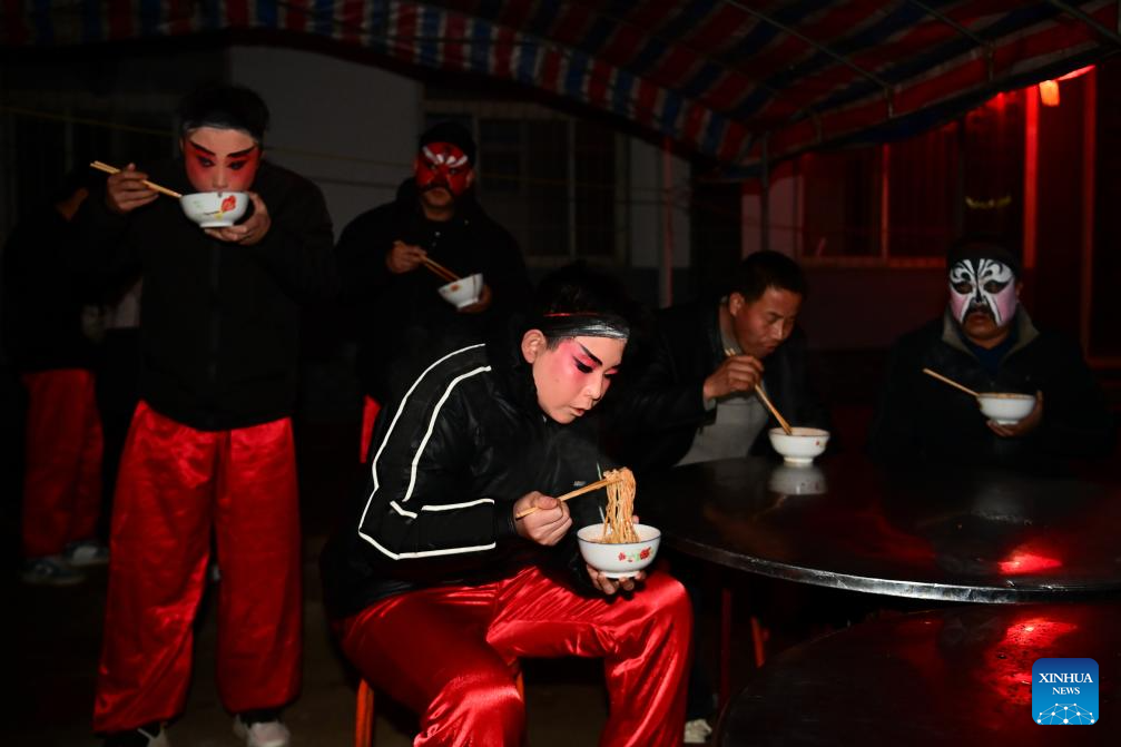 Miembros de un equipo de desfile Shehuo desayunan, en la aldea Huanghuayu, en el distrito de Longxian de la ciudad de Baoji, en la provincia de Shaanxi, en el noroeste de China, en las primeras horas del 2 de marzo de 2026. Shehuo es una forma de arte folclórico tradicional chino. El distrito de Longxian celebró un desfile local especial de Shehuo el lunes, con artistas a caballo ataviados con un maquillaje facial sencillo pero exquisito. (Xinhua/Zou Jingyi)