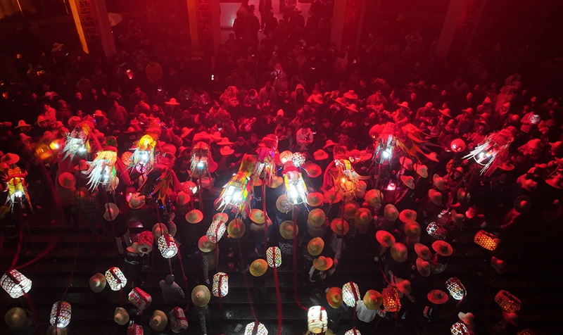 La noche del 26 de febrero, 13 equipos de faroles de dragón de las aldeas locales realizaron una espectacular danza del dragón entre fuegos artificiales en la ciudad de Mengxi, distrito autónomo de la etnia miao de Songtao, provincia de Guizhou, en el suroeste de China. Esta actividad folclórica tradicional atrajo a decenas de miles de visitantes para celebrar el Año Nuevo chino.