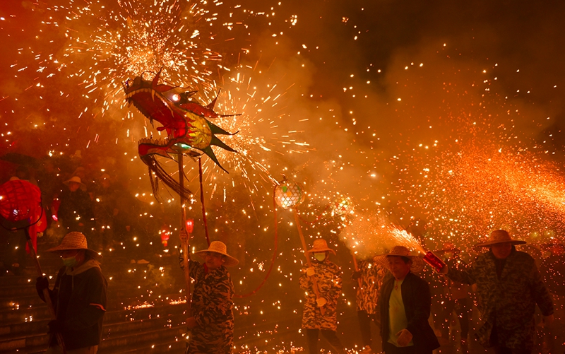Danza del dragón entre fuegos artificiales para celebrar el Año Nuevo chino en la ciudad de Mengxi, distrito autónomo de la etnia miao de Songtao, provincia de Guizhou, suroeste de China, el 26 de febrero de 2026. (Foto/Diario del Pueblo en línea).