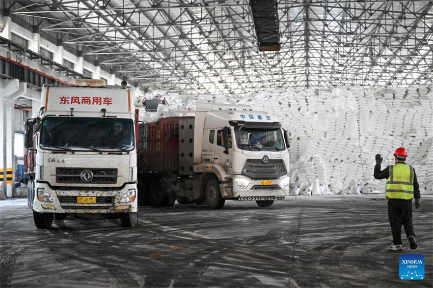 Imagen del 5 de marzo de 2026 de camiones esperando por carga en una empresa de fertilizantes, en el distrito de Manas de la prefectura autónoma de la etnia hui de Changji, en la región autónoma uygur de Xinjiang, en el noroeste de China. Los fabricantes de suministros agrícolas de Xinjiang trabajan a plena capacidad para cumplir con los pedidos y garantizar un flujo constante de fertilizantes y materiales para la agricultura de primavera. (Xinhua/Ding Lei)