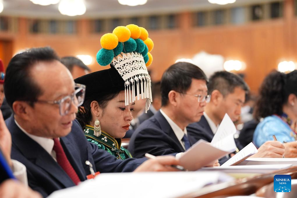 Jin Ruirui (2.ª por la izquierda), diputada de la 14.ª Asamblea Popular Nacional (APN), asiste a la sesión inaugural de la cuarta sesión de la 14.ª APN en el Gran Palacio del Pueblo en Beijing, capital de China, el 5 de marzo de 2026. (Xinhua/Xing Guangli).