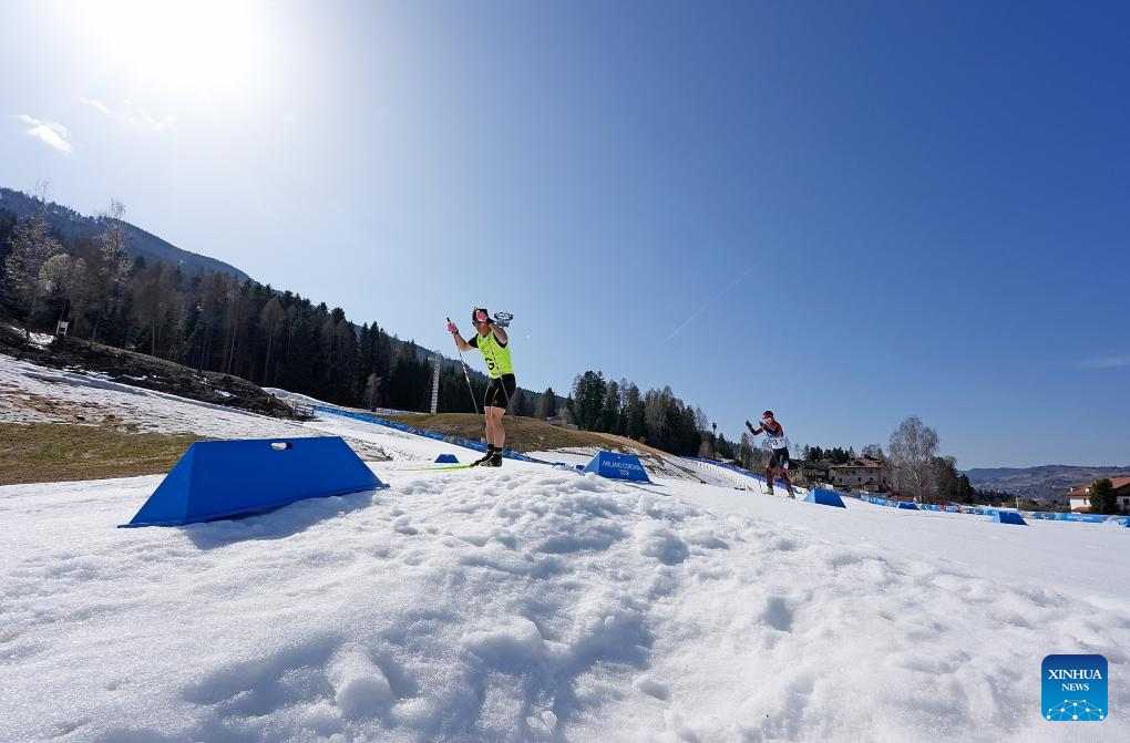 Wang Yue (d) y su guía Chen Guoming, de China, compiten durante la final de individual femenino con discapacidad visual de para biatlón en los Juegos Paralímpicos de Invierno Milán-Cortina 2026, en Tesero, Italia, el 8 de marzo de 2026. (Xinhua/Hou Zhaokang)