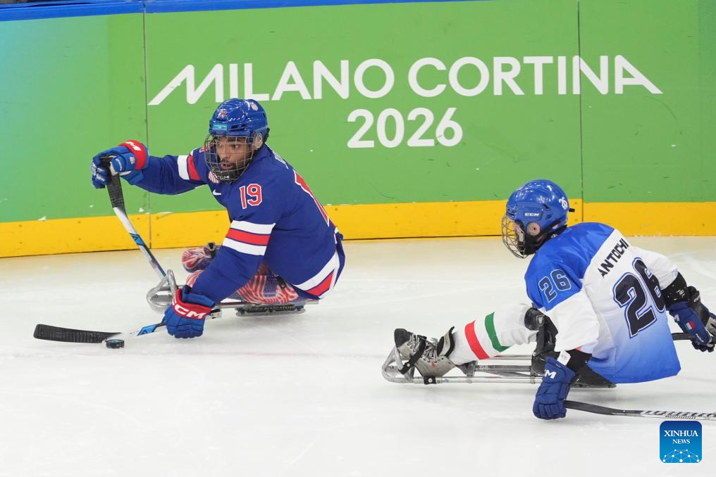 Imagen del 7 de marzo de 2026 de Malik Jones (i), de Estados Unidos, controlando el disco durante el partido de la ronda preliminar del Grupo A entre Estados Unidos e Italia de para hockey sobre hielo en los Juegos Paralímpicos de Invierno Milán-Cortina 2026, en Milán, Italia. (Xinhua/Hou Jun)