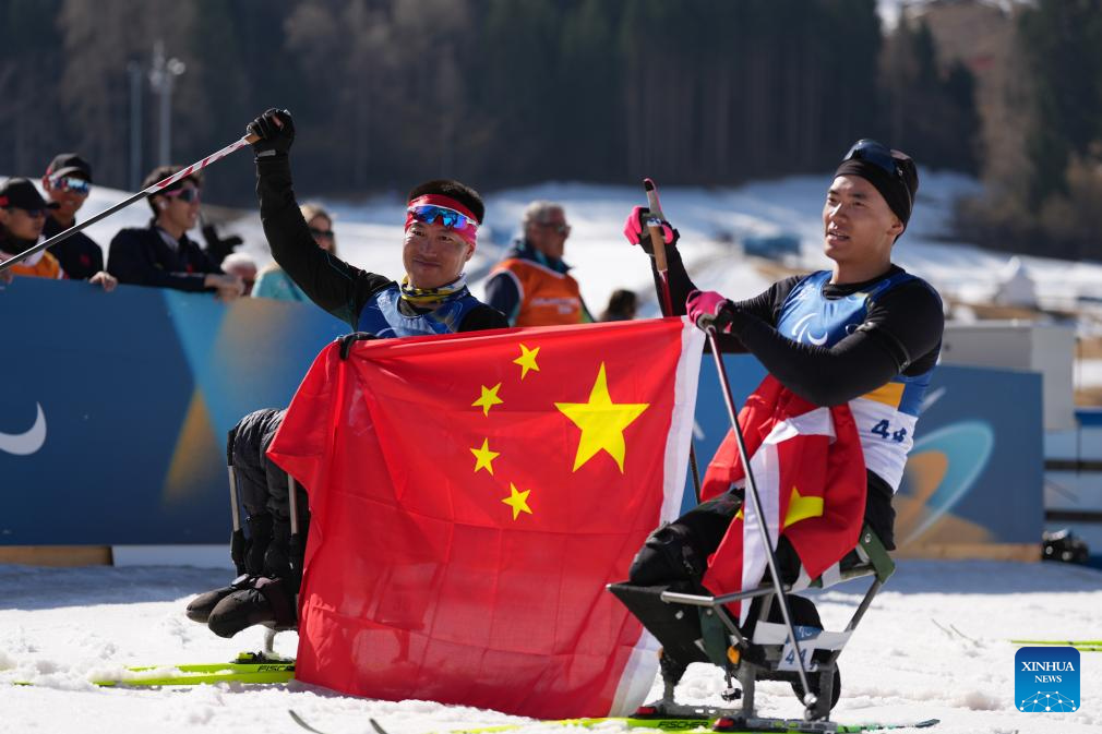 Liu Zixu (d), y Mao Zhongwu, de China, festejan al término de la final de individual masculino sentado de para biatlón en los Juegos Paralímpicos de Invierno Milán-Cortina 2026, en Tesero, Italia, el 8 de marzo de 2026. (Xinhua/Lian Zhen)