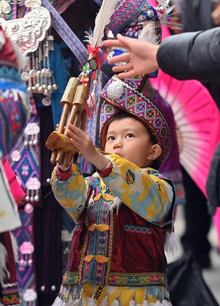 Un niño toca el lusheng durante el festival «Pohui» en una zona pintoresca del distrito autónomo de la etnia miao de Rongshui, ciudad de Liuzhou, región autónoma de la etnia zhuang de Guangxi, en el sur de China, el 8 de marzo de 2026. (Foto de Zheng Changhao/Xinhua).