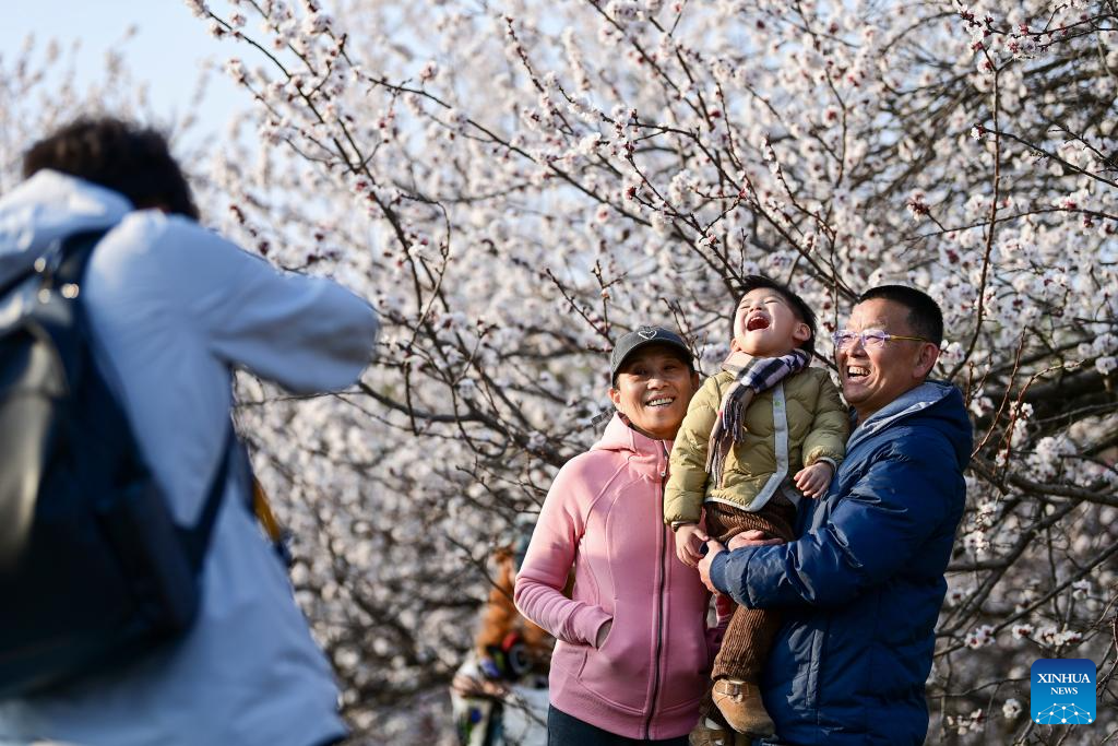 Turistas posan para las fotografías con los árboles en flor en el Parque Nacional del Patrimonio Cultural del Palacio Daming, en Xi'an, provincia de Shaanxi, en el noroeste de China, el 9 de marzo de 2026. (Xinhua/Zou Jingyi).