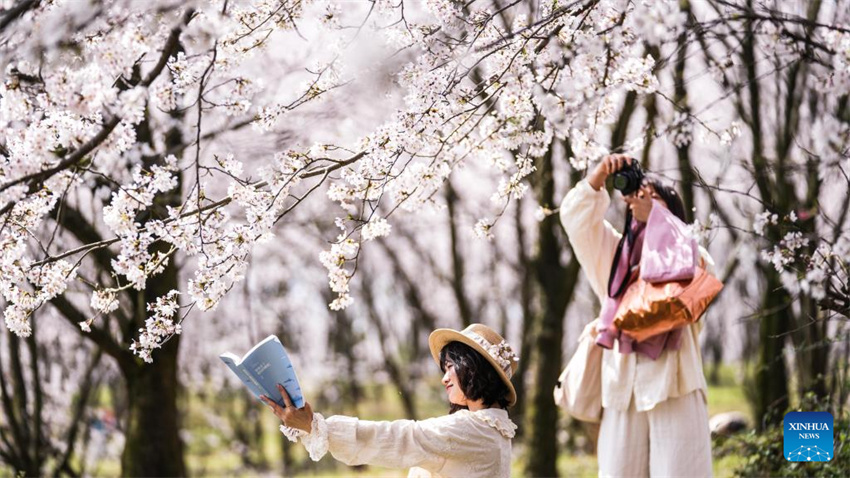 Una turista posa para una foto en un jardín de cerezos en la Nueva Área de Gui'an, provincia de Guizhou, suroeste de China, el 11 de marzo de 2026. (Xinhua/Tao Liang).