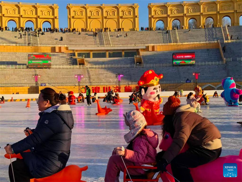 Ciudadanos juegan en la “pista de hielo al atardecer” del parque Lanshan, en Yinchuan, región autónoma de la etnia Hui de Ningxia, al noroeste de China, el 7 de febrero de 2026. (Xinhua/Ma Sijia).