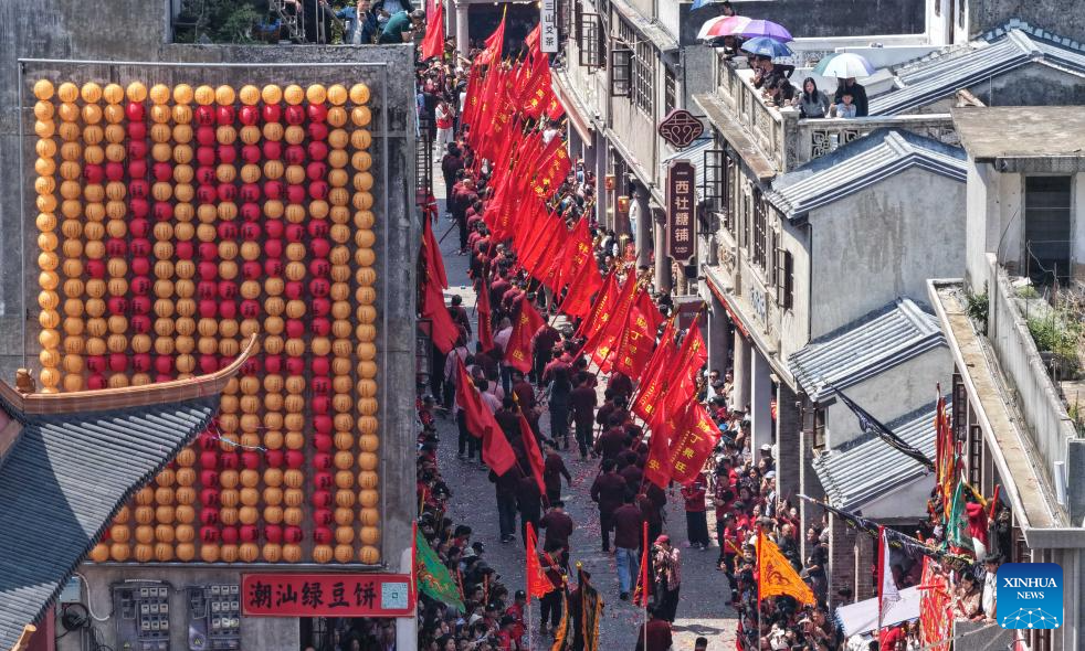 Esta foto aérea tomada con un dron el 11 de marzo de 2026 muestra un desfile durante la feria del templo Chenghuang en Jieyang, provincia de Guangdong, en el sur de China. (Xinhua/Deng Hua).