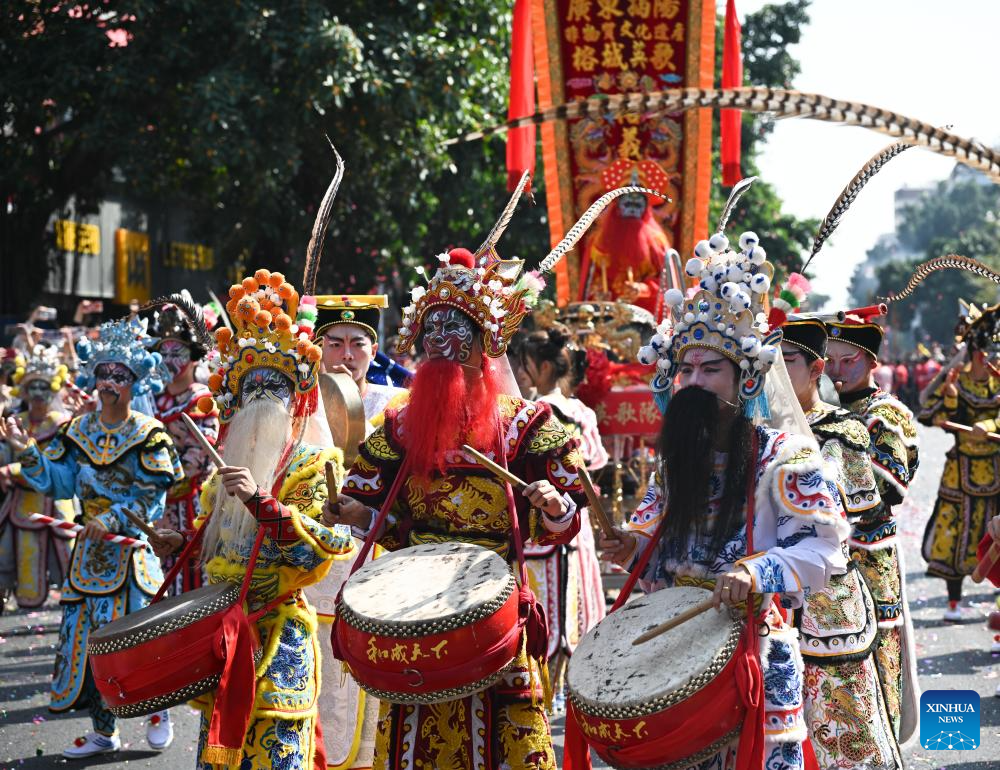 Esta foto tomada el 11 de marzo de 2026 muestra una danza Yingge, o «danza de la canción del héroe», durante la feria del templo Chenghuang en Jieyang, provincia de Guangdong, en el sur de China. (Xinhua/Deng Hua).