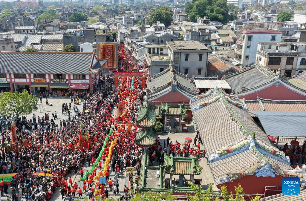 Esta fotografía aérea tomada con un dron el 11 de marzo de 2026 muestra un desfile durante la feria del templo Chenghuang en Jieyang, provincia de Guangdong, al sur de China. (Xinhua/Deng Hua).