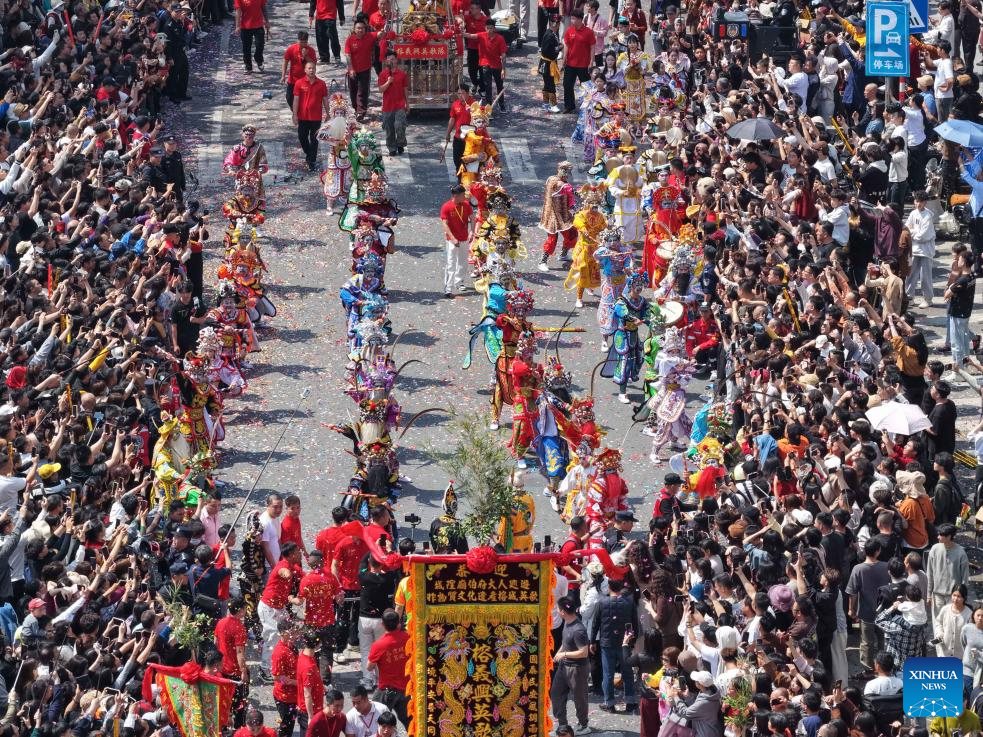 Esta foto aérea tomada con un dron el 11 de marzo de 2026 muestra una danza Yingge durante la feria del templo Chenghuang en Jieyang, provincia de Guangdong, sur de China. (Xinhua/Deng Hua).