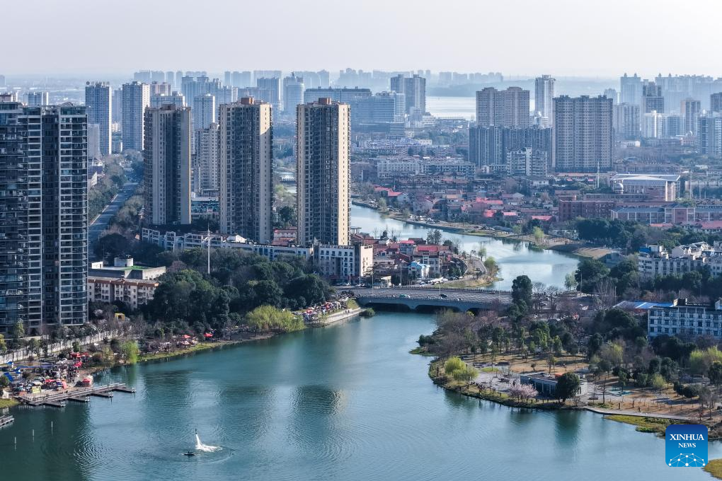 Una foto aérea tomada con un dron el 11 de marzo de 2026 muestra el paisaje urbano a lo largo del río Chuanzi en Changde, provincia de Hunan, en el centro de China. (Xinhua/Chen Sihan).