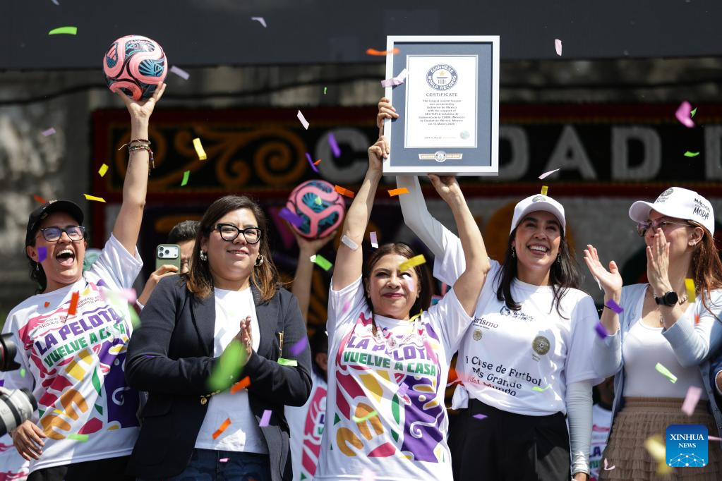 La jefa de Gobierno de la Ciudad de México, Clara Brugada (c), sostiene el certificado del Récord Guinness por la Clase de Futbol más Grande del Mundo, en el Zócalo de la Ciudad de México, capital de México, el 15 de marzo de 2026. La Ciudad de México se adjudicó el domingo el récord Guinness para la clase de fútbol más grande en el mundo, entre llamados para detener los conflictos armados y a solo unos cuantos meses de que el país también haga historia al desarrollar por tercera ocasión la Copa Mundial de la Federación Internacional de Fútbol Asociación (FIFA). (Xinhua/Francisco Cañedo)