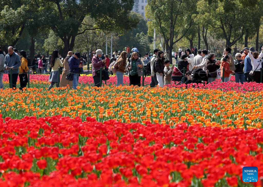 La gente contempla las flores en el parque Daning de Shanghai, en el este de China, el 14 de marzo de 2026. (Xinhua/Liu Ying).